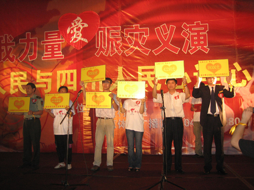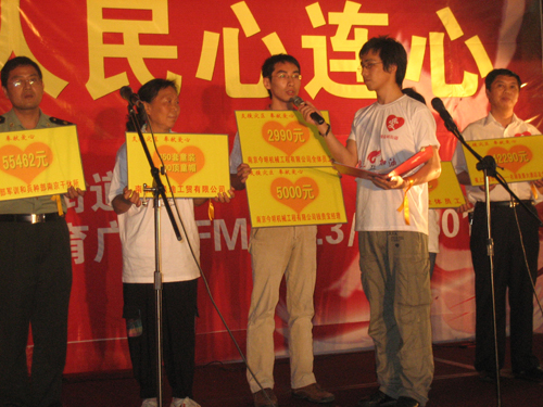 晚19點(diǎn)整,天空下起了陣雨,主持人曉龍宣布全體起立向在四川大地震中遇難同胞默哀1分鐘。晚會在鎖金五村社區(qū)一曲《愛的奉獻(xiàn)》中拉開了序幕,隨后,社區(qū)居委會、轄區(qū)企事業(yè)單位、南京體育廣播的全體主持人演出了自編自演的詩朗誦、歌伴舞等節(jié)目,生動感人,催人淚下;正在災(zāi)區(qū)奮勇抗災(zāi)的成都軍區(qū)某部列兵王羽歆的母親現(xiàn)場表達(dá)了社區(qū)居民對抗災(zāi)軍民的問候與祝愿;殘奧會冠軍、奧運(yùn)火炬手白萬里等專程趕到現(xiàn)場參加募捐,臺上臺下互動聲此起彼伏“四川加油!中國加油!”。