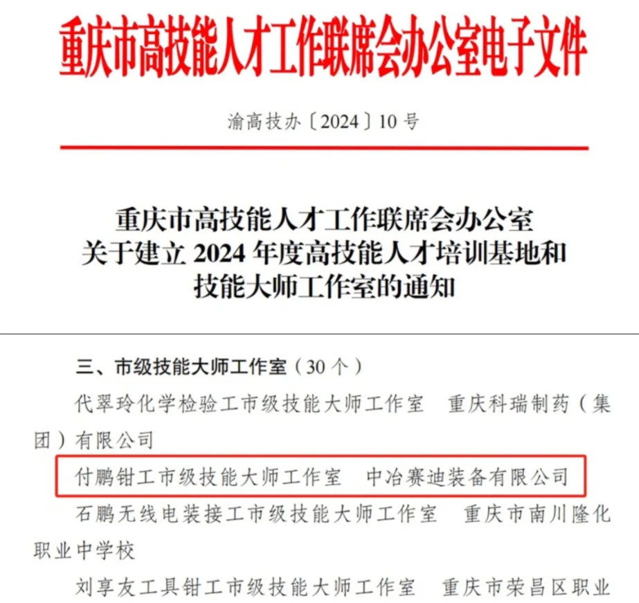 9月24日,重慶市高技能人才工作聯(lián)席會辦公室下發(fā)《關于建立2024年度高技能人才培訓基地和技能大師工作室的通知》,賽迪裝備申報的“付鵬鉗工市級技能大師工作室”成功獲批建設。技能大師工作室由重慶市委組織部與重慶市人力資源和社會保障局聯(lián)合組織建立,本次成功獲批是對公司技能人才培養(yǎng)工作的認可和支持,為公司今后的高技能人才隊伍建設提供了更加堅實的政策保障。