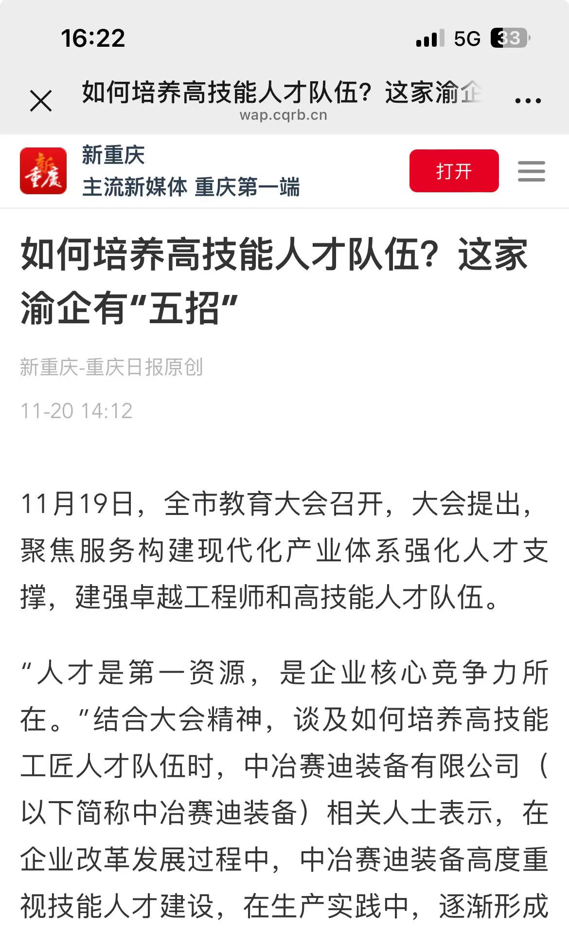 11月19日,全市教育大會(huì)召開,大會(huì)提出,聚焦服務(wù)構(gòu)建現(xiàn)代化產(chǎn)業(yè)體系強(qiáng)化人才支撐,建強(qiáng)卓越工程師和高技能人才隊(duì)伍。 11月20日,新重慶-重慶日?qǐng)?bào)以“如何培養(yǎng)高技能人才隊(duì)伍?這家渝企有‘五招’”為題,報(bào)道中冶賽迪裝備在技能人才建設(shè)中的經(jīng)驗(yàn)做法。